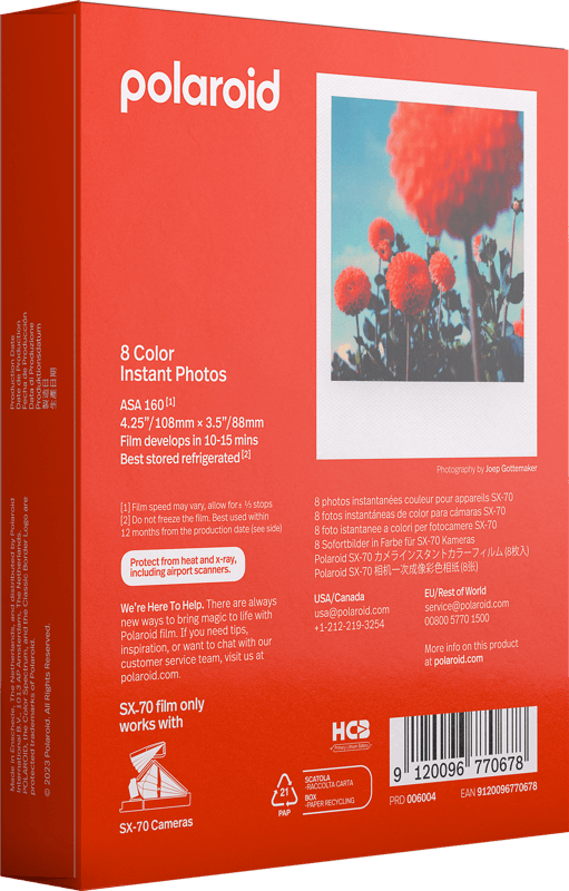 Bilderna börjar framträda inom 2 minuter. Full framkallning tar 10-15 minuter. SX-70-filmen har ett lägre ISO än våra andra filmer, vilket gör den perfekt för att fånga fina detaljer i väl upplysta förhållanden. Den här filmen är älskad av konstnärer och professionella fotografer och ger bilder med rika färger, välbalanserade toner och distinkt analog textur. Den är ett utmärkt val för alla som vill utveckla sitt fotograferande.